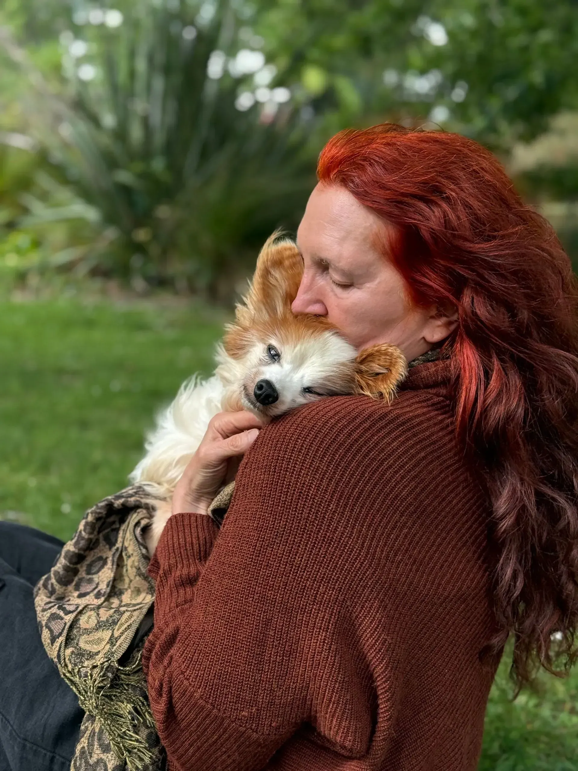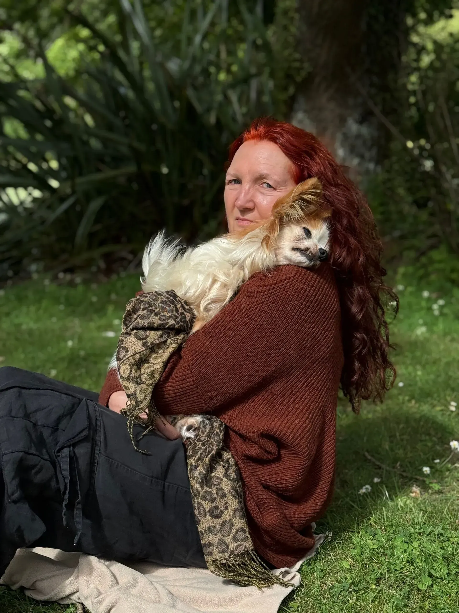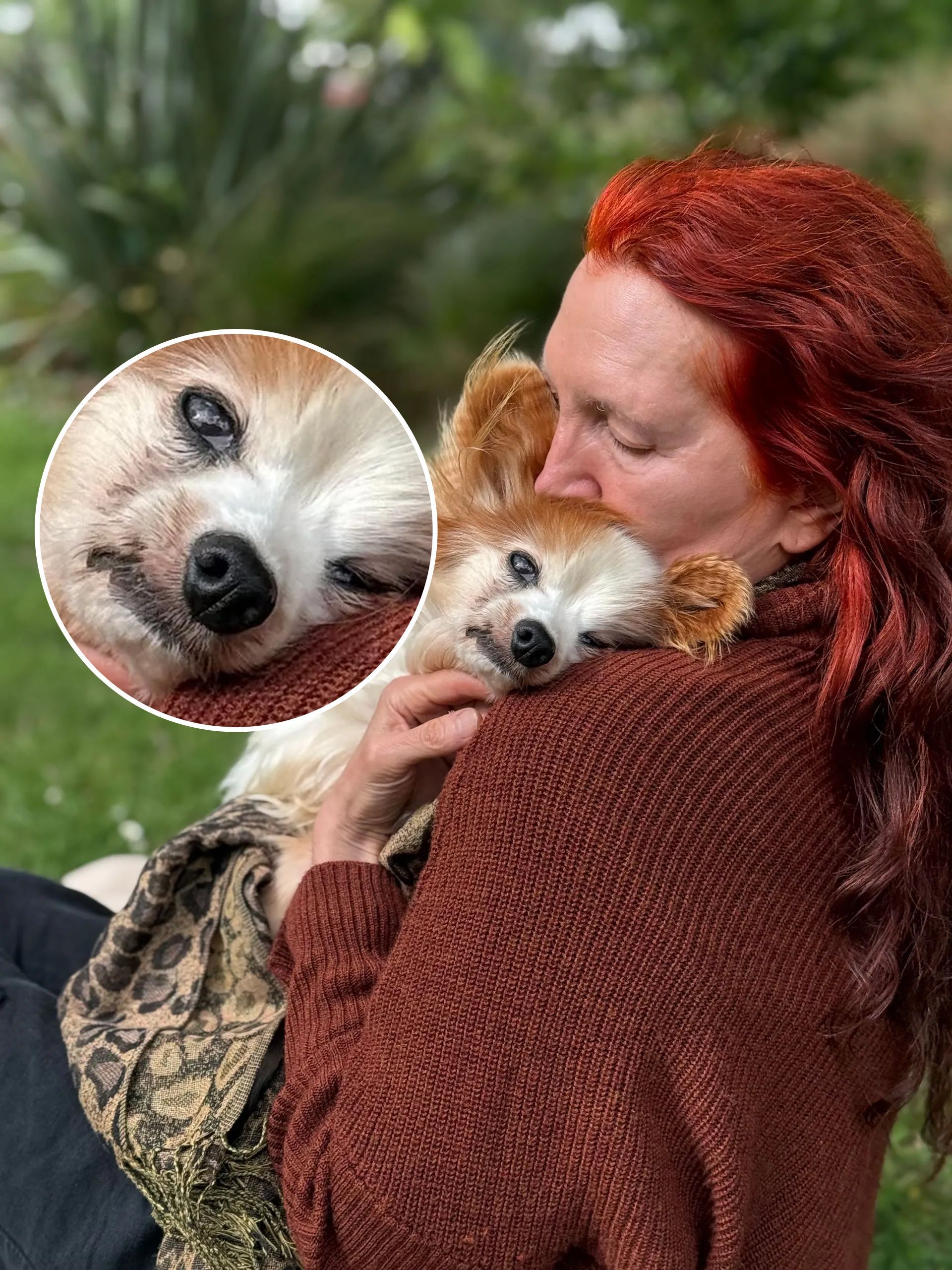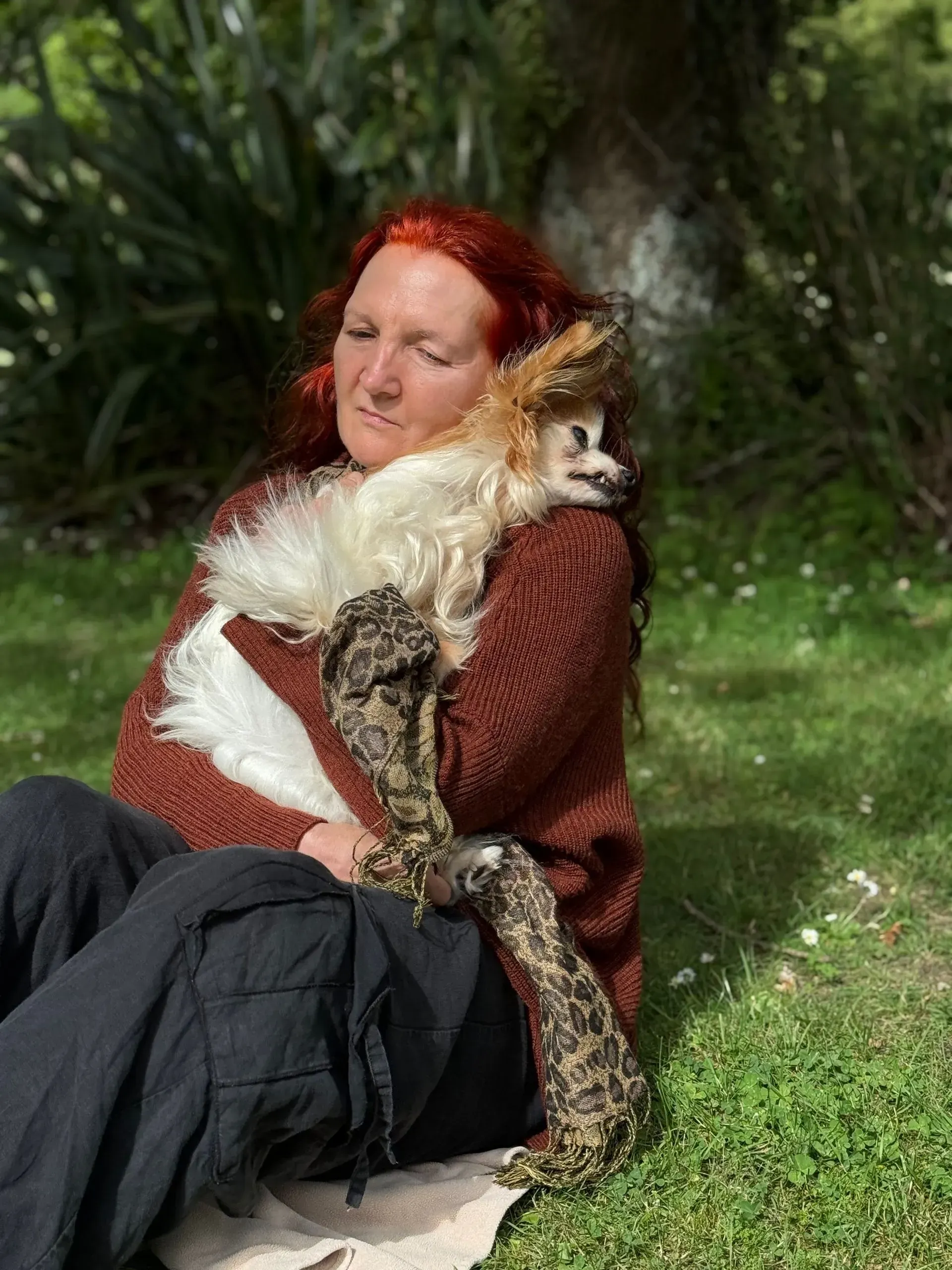 Spaced out to the maximum: Harry shows total, symmetrical flaccidity, hanging "coathanger-style" over the shoulder. The "spaced out" gaze matches the description of the vacant look that was mislabelled as a brain event. Despite being in his owner's arms, he exhibits a total absence of sensory engagement, confirming his system was pharmacologically overloaded.