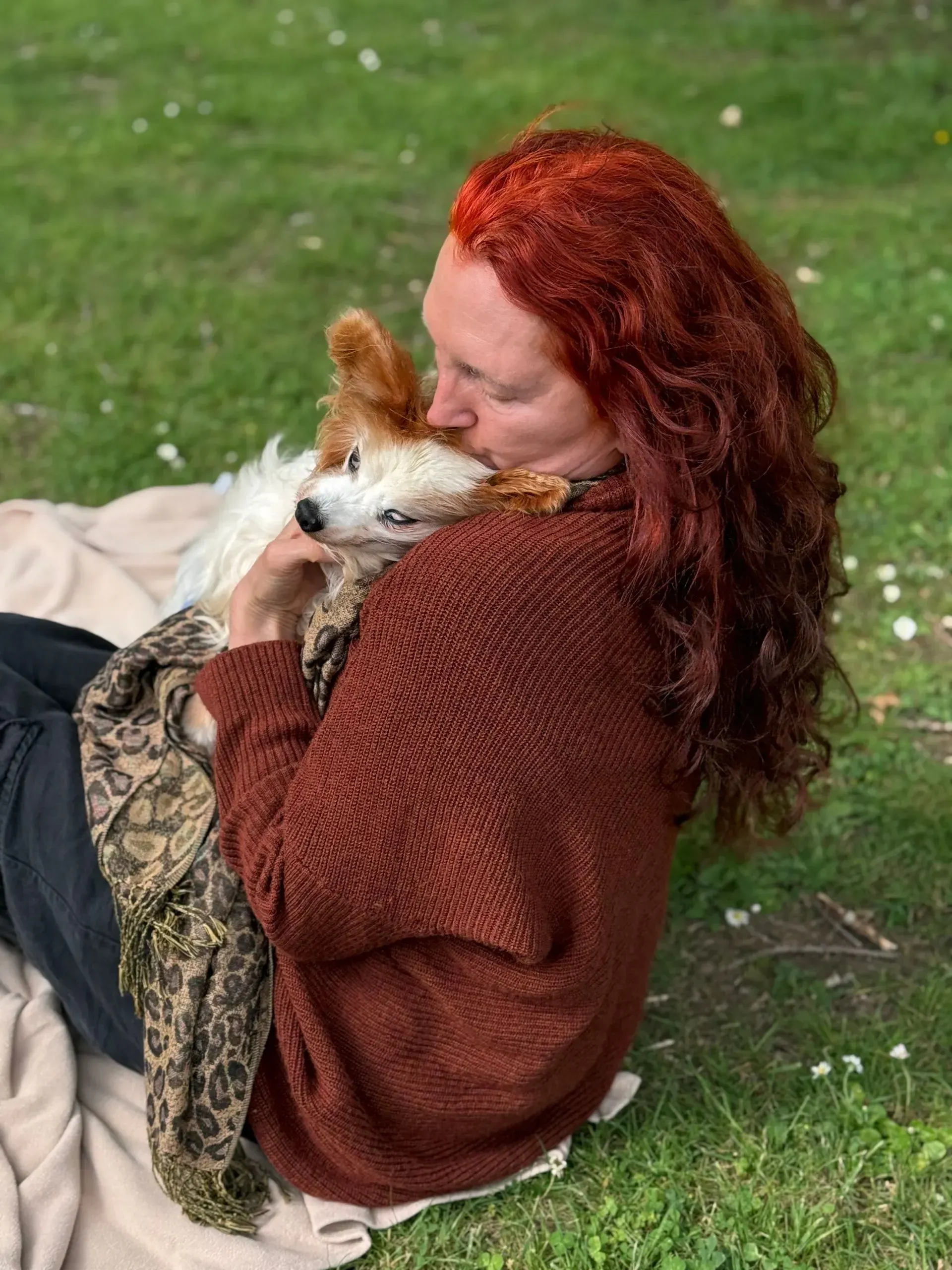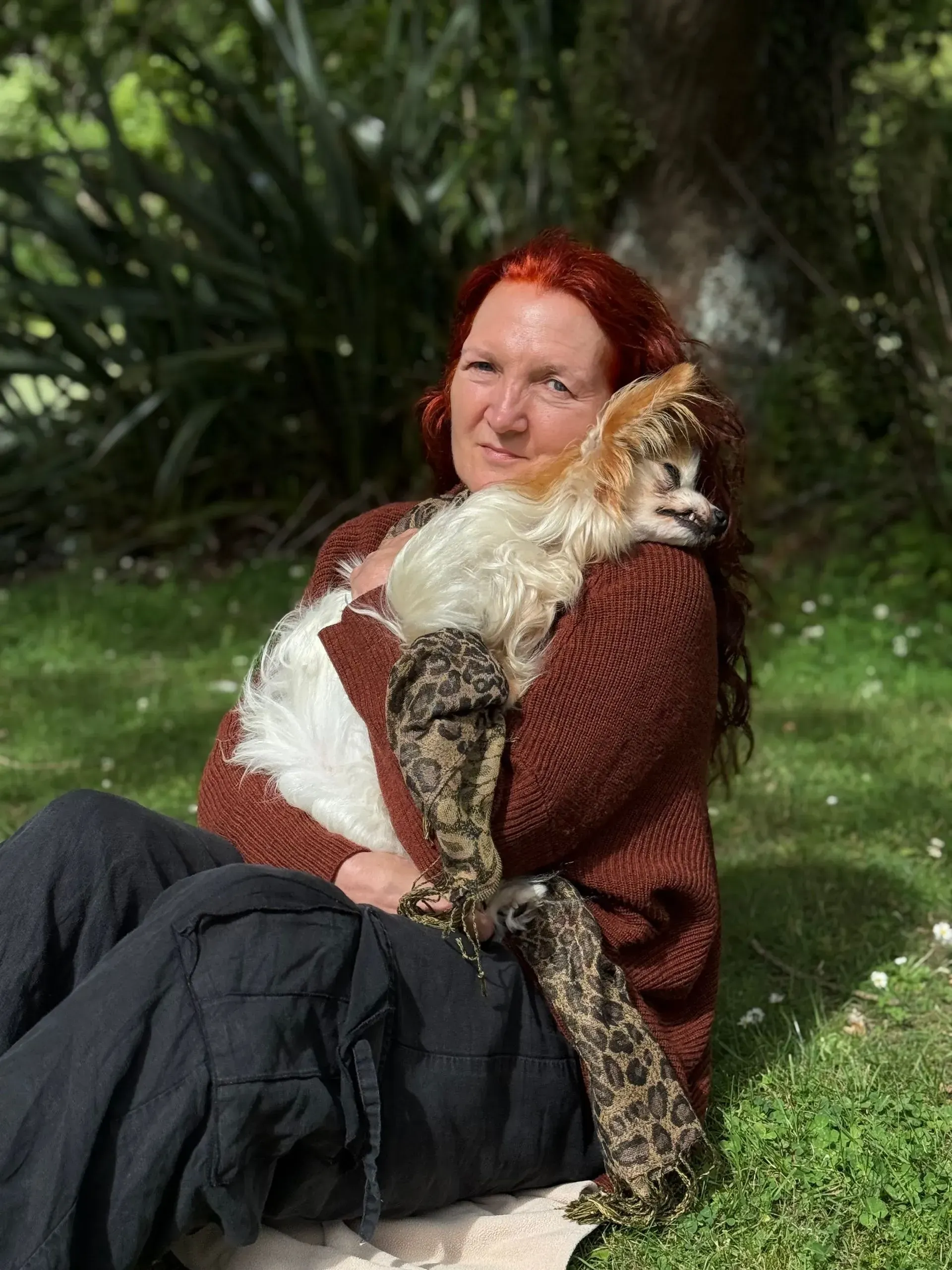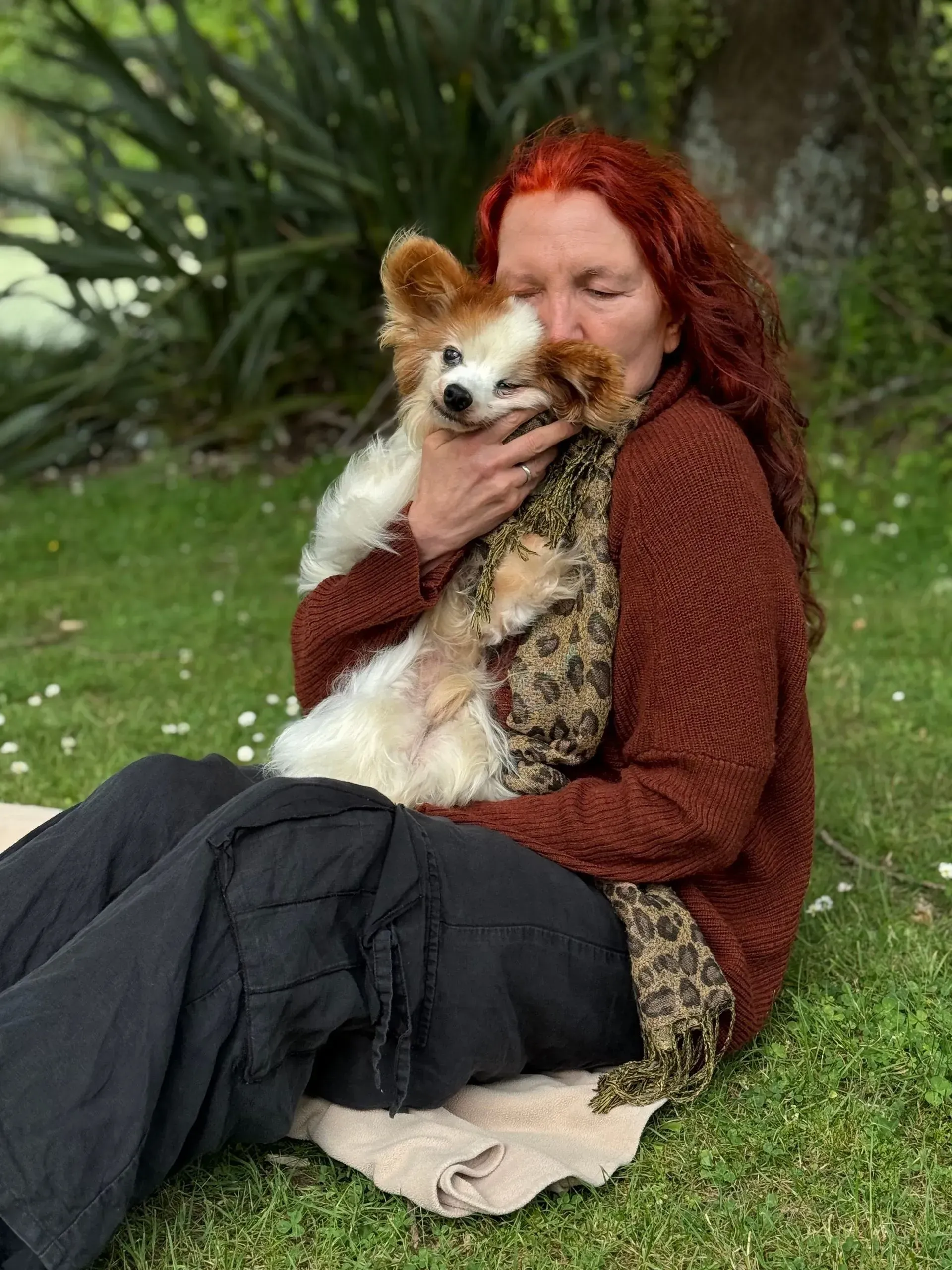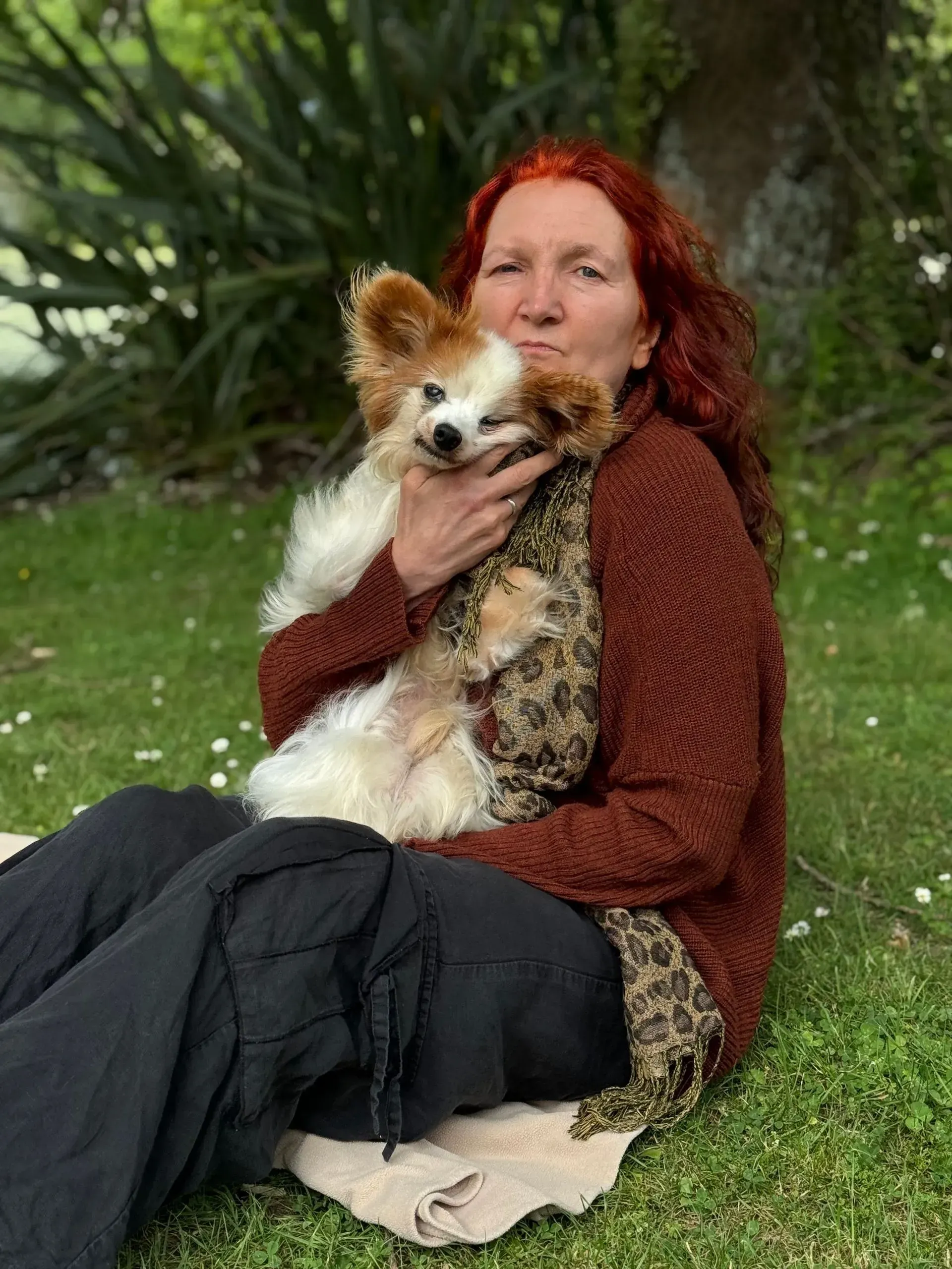 Spaced out to the maximum: Harry shows total, symmetrical flaccidity, hanging "coathanger-style" over the shoulder. The "spaced out" gaze matches the description of the vacant look that was mislabelled as a brain event. Despite being in his owner's arms, he exhibits a total absence of sensory engagement, confirming his system was pharmacologically overloaded.