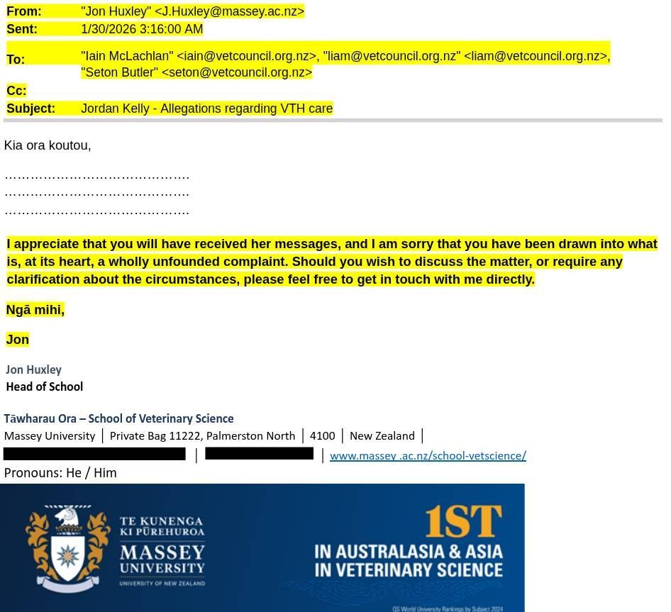 I am writing regarding recent correspondence from Ms Jordan Kelly, in which she has made a number of serious allegations about the care provided by the Veterinary Teaching Hospital in Tāwharau ora – School of Veterinary Science at Massey University.