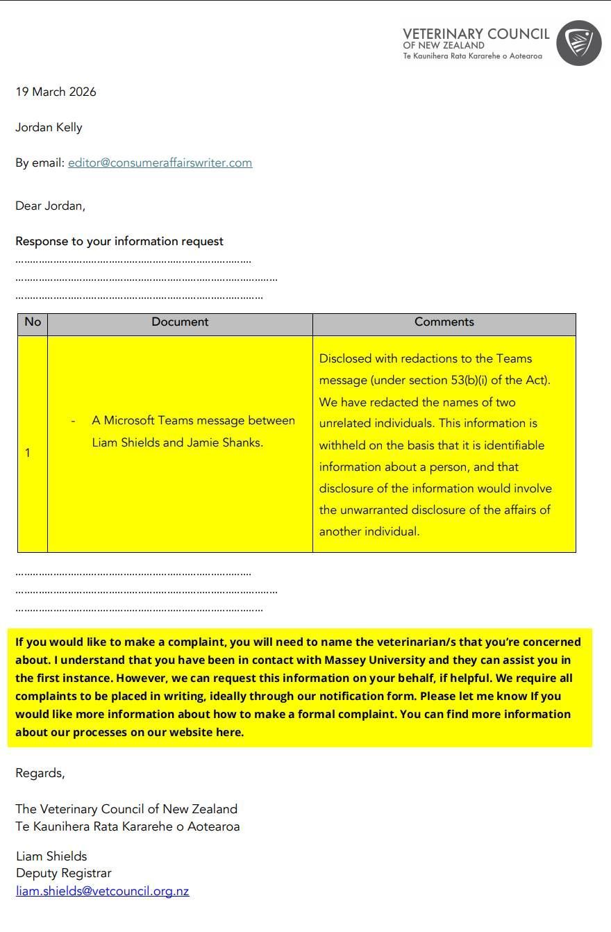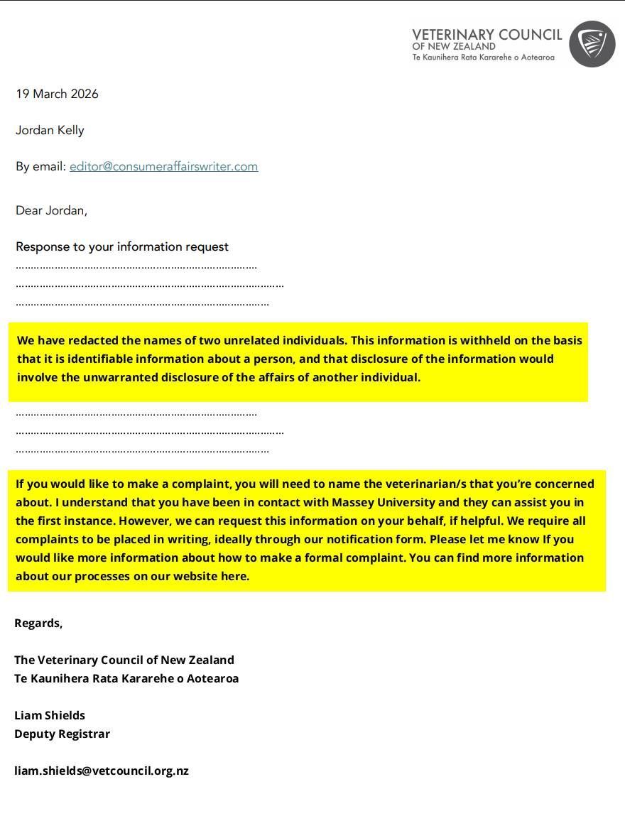 On February 19, 2026, I wrote to VCNZ McLachlan seeking again his very specific assistance to extract the names and position titles of the licenced staff involved in the whole affair, because – without them – a complainant cannot lodge a complaint in the first place. To be clear (and because the average pet owner would not know this), you can't lodge a complaint against an institution or a veterinary clinic. The system has been neatly set up such that the only way to lodge a complaint is against the individual veterinarian. And what the vet clinic in question – especially those with dodgy staff, records and practices – will often or even typically do (as Massey does), is not tell a client the name of the veterinarian but just have them introduce themselves by their first or informal names. If you've read my coverage leading up to the most recent few articles, you'll see that the only name I had been given for the (what turned out to be just an) "intern" (ironically, the woman who killed my dog) was "Steffi". Believe me, I did NOT use that name for her out of any affection . . . I used it because that's how Massey protect their own i.e. by not disclosing their identities. I guess there's always been a reason for it. Pity pet owners don't put two and two together.